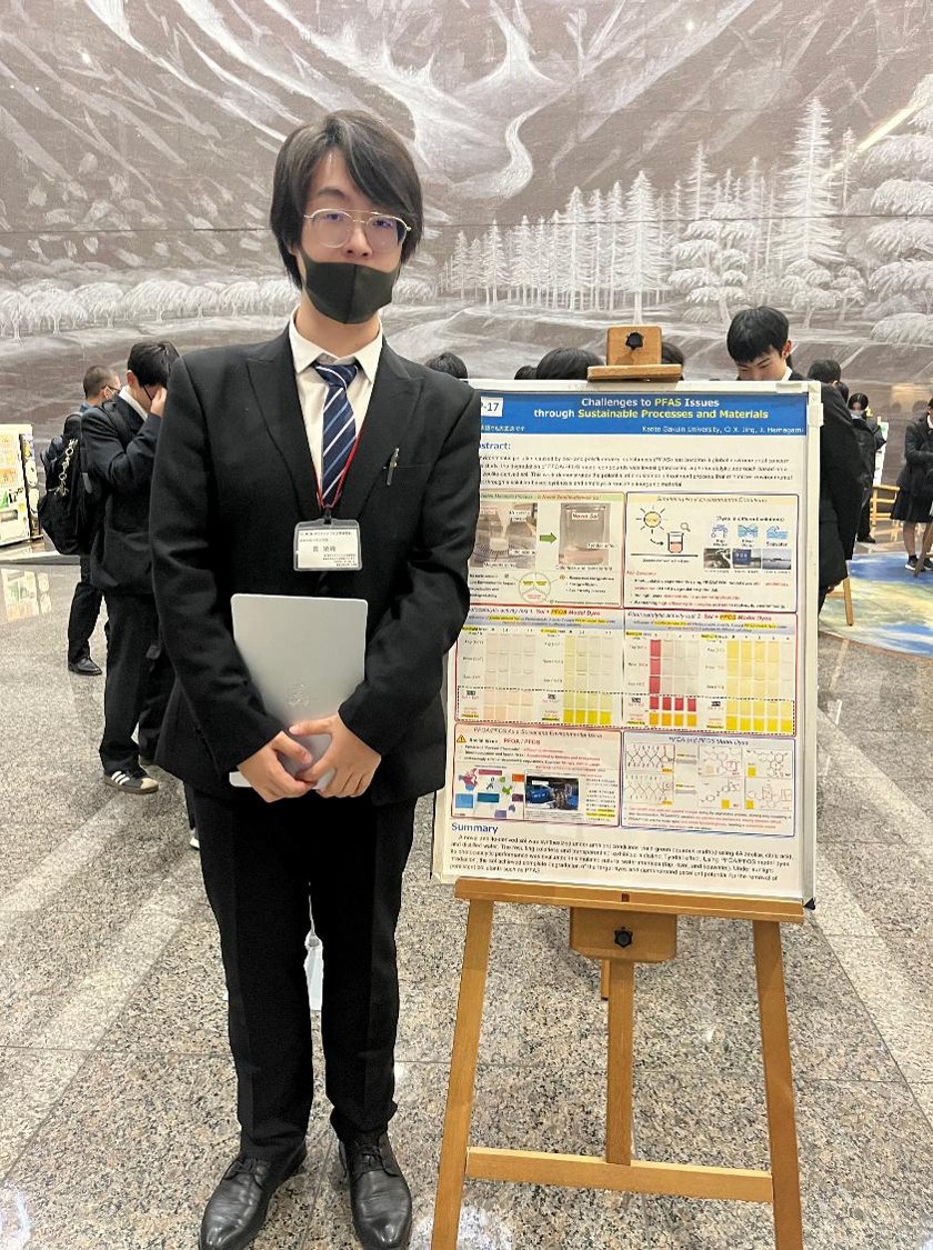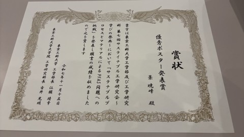 2025年11月15日(土)、東京工科大学八王子キャンパスで開催された「第7回サステイナブル工学研究会」において、本学大学院 工学研究科 物質生命科学専攻 M2 の景 曉峰さん(中国・南京師範大学出身)が優秀ポスター発表賞を受賞しました。景さんが所属する濱上寿一研究室では、サステナブルマテリアルとして注目されるゼオライトの高機能化に着目し、安価で安全なゼオライト・クエン酸・蒸留水のみを用いた室温・完全水系のサステナブルプロセスにより、透明な“新規ゼオライト由来ゾル”の合成に成功しています。ゼオライトは、地殻に最も多く存在する元素(クラーク数1位:酸素、2位:ケイ素、3位:アルミニウム)を主成分とし、資源的にも非常に豊富です。その多孔質構造は2025年ノーベル化学賞の受賞対象となったMOF(金属有機構造体)と深く関連しており、機能性材料として高い将来性を有します。本研究では、PFAS汚染を模擬するためにPFASモデル色素物質を用い、太陽光照射下での光分解性能を評価しました。水道水・河川水・海水といった実環境に近い条件でも高い分解効率を示し、次世代型水処理ナノ材料として高い評価を受けました。さらに、本発表は全て英語で実施され、国際性と研究発信力の高さも審査員から高く評価されました。応用化学コース/物質工学専攻では、中国をはじめ海外からの学部/大学院進学者を広く受け入れており、ナノマテリアルズサイエンスの最先端研究を国際的環境の中で学ぶことができます。景さんは2026年4月から博士後期課程への進学を予定しており、今後さらなる研究の進展が期待されます。