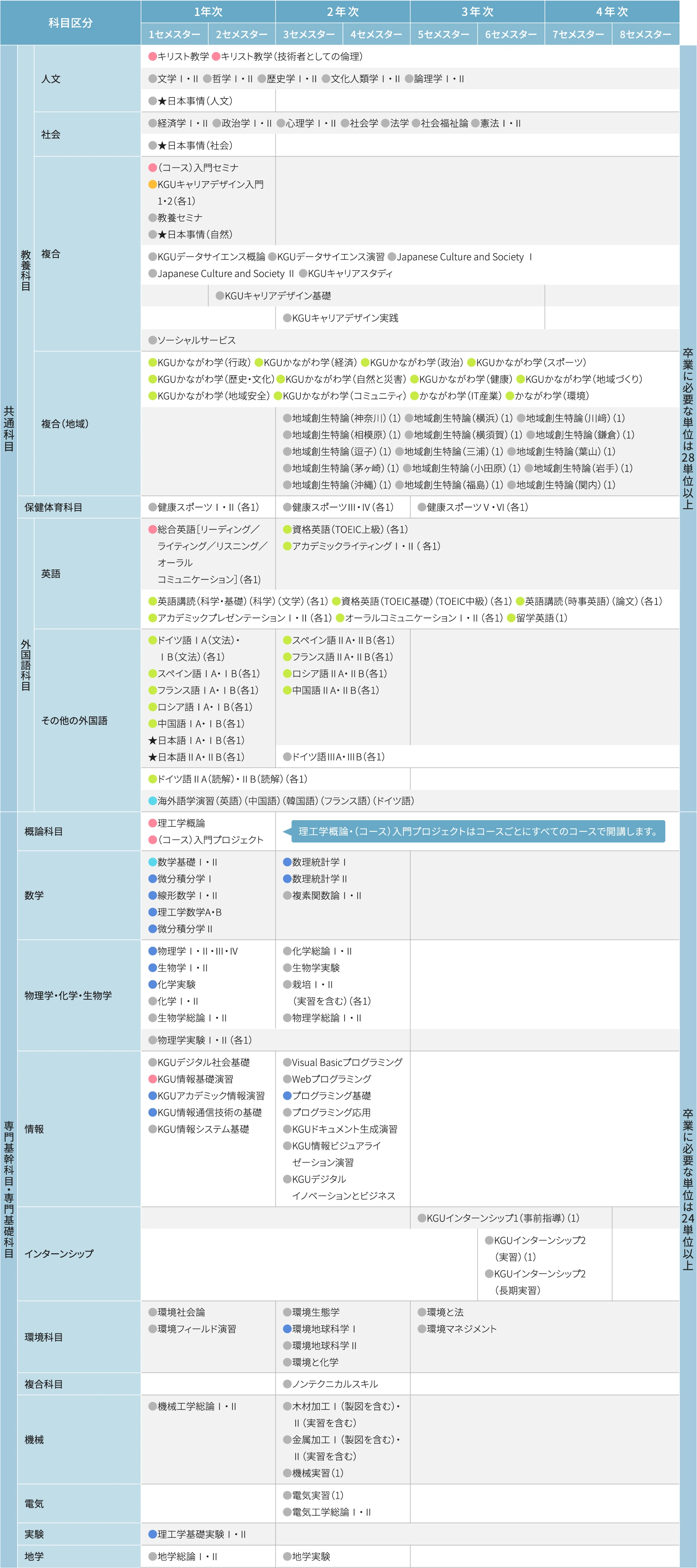 第1~2セメスターの導入教育のクラスを利用して、学生と教員が自由に会話できる雰囲気づくりを行い、大学生活のスタート時における適切なアドバイスを行います。さらには、このクラスの枠を越えて、全ての教員が学生からの質問や相談には常に気軽に応じます。各教員が担当する実験科目や卒業研究を通して、学生との会話を心掛けています。これにより、学習や就職活動に関する相談を受けた場合に、適切にアドバイスすることができます。各教員が担当する授業内容に関する質問には、メールなどを活用することにより迅速に対応します。直接訪問による質問にも、可能な限り対応します。大学院進学や就職活動に必要となる英語力を身に付けてもらうため、「卒業研究基礎」や「卒業研究I、II」の中で、専門分野の英語教育を行います。卒業研究における研究室配属は固定的なものとせず、共同研究の進展などにより必要が生じた場合には適宜配属替えを行い、常に最適な研究指導を行います。