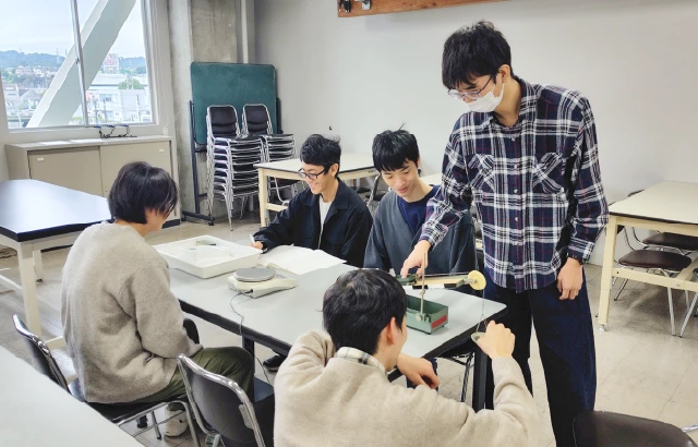 1年生から2年生にかけては、「理工学基礎実験」という科目で、重力加速度や音速など基本的な物理量を測定する実験を行います。その後2年生から3年生にかけては、「数物学実験」という科目で、放射線の透過力や黒体輻射の温度測定など、より発展的な実験を行います。 写真は理工学基礎実験の様子です。