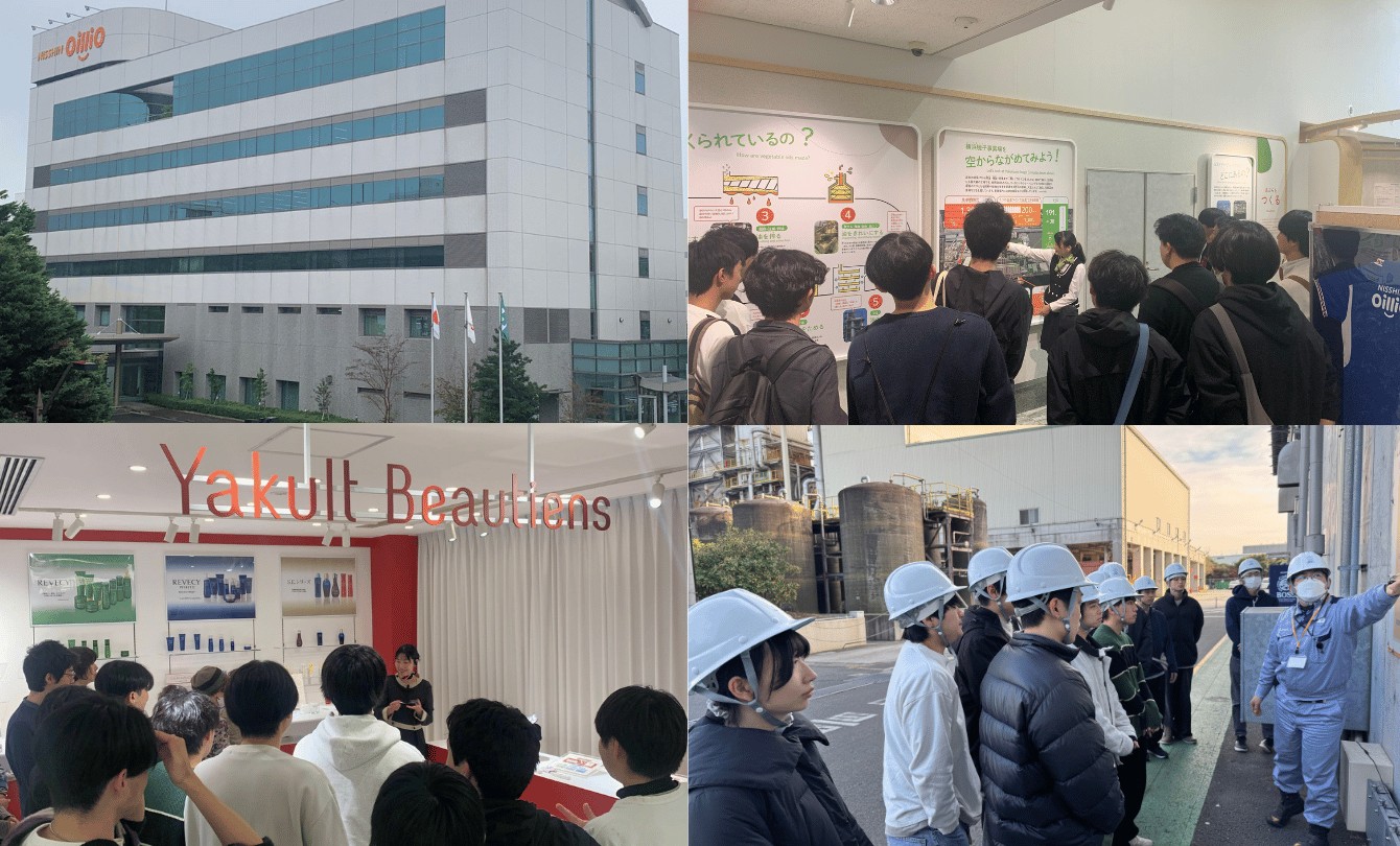 今年度から応用化学コースで開講された「施設見学実習」は、化学や社会インフラに関連する最前線の現場を直接見学し、教室で学んだ理論がどのように社会を支える技術として具体化されているかを深く理解することを目的としています。今年度は、神奈川県内にある金沢水再生センター,日清オイリオ,Yakult湘南化粧品工場,Jバイオフードリサイクルの4施設を見学してきました。